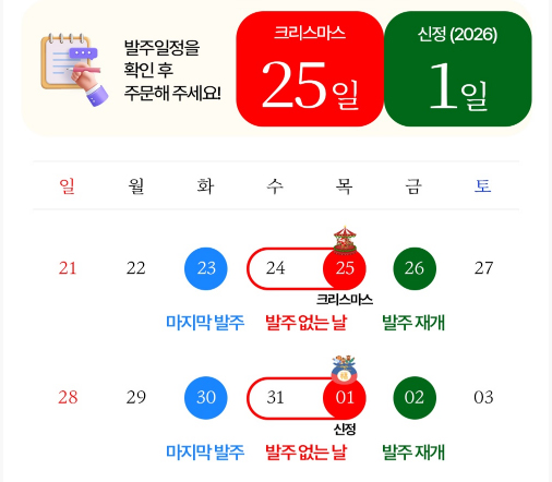 [중요] 12월 공휴일 계란 발주 및 배송 일정 변경 안내.