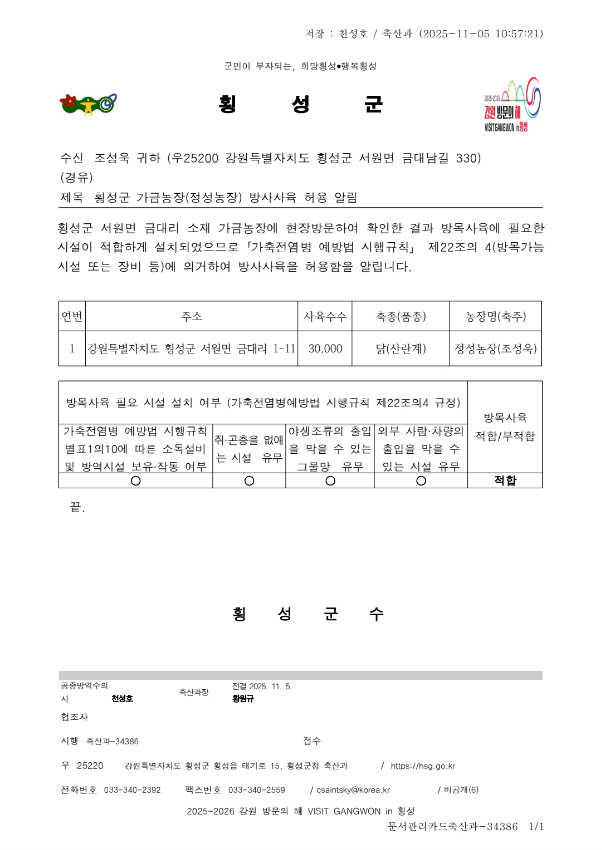 최근 공문 결과,정성농장은 가축전염병 예방법 시행규칙 기준을 모두 충족